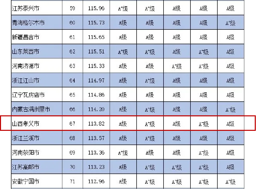 全省唯一孝義市全國第67位