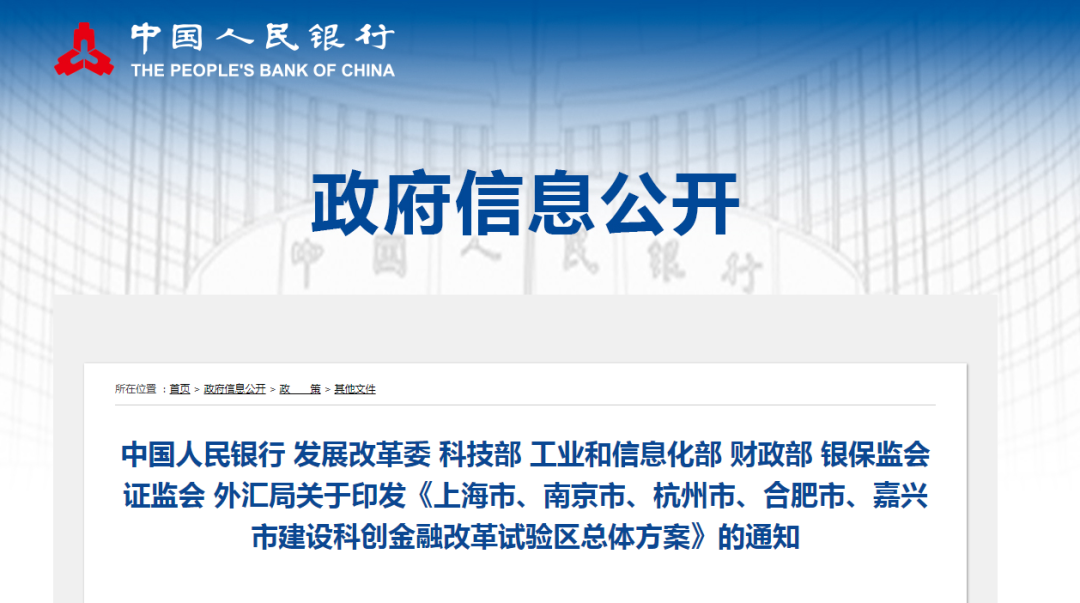 為深入貫徹習近平總書記關于長三角一體化發展和創新體系建設的重要指示和講話精神,認真落實黨中央、國務院決策部署,按照《長江三角洲區域一體化發展規劃綱要》和《國家創新驅動發展戰略綱要》要求,經國務院同意,2022年11月18日,人民銀行、發展改革委、科技部、工業和信息化部、財政部、銀保監會、證監會、外匯局印發《上海市、南京市、杭州市、合肥市、嘉興市建設科創金融改革試驗區總體方案》